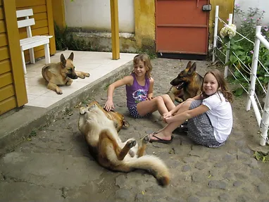 Mady: Here is me and Jade with the 3 guard dogs at our little cabin. The girl that is on the porch her name is Nadia, the boy on his back is Jagger and the one sitting up beside me is Carruso.