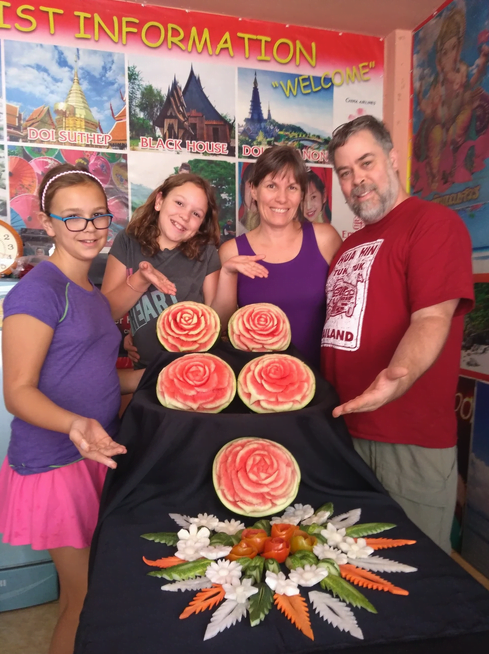 Mady: We we went to fruit carving. It was so extraordinary. But sometimes it was very hard and sometimes it was so easy. We made plain fruits and vegetable into masterpieces. And it makes you like vegetables and fruit a lot more. We carved a watermelon into a rose, carrots and cucumbers into leaves, and radish into flowers.